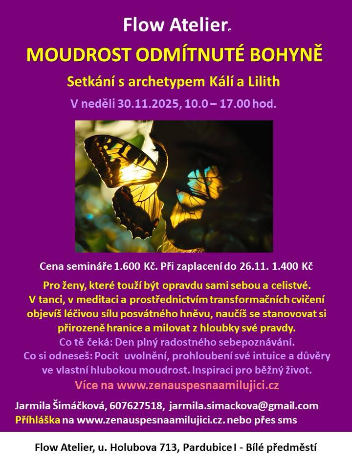 Objev v sobě sílu bohyní Lilith a Kálí – archetypů, které spojují divokost, moudrost a lásku. V tanci, meditaci a transformačních cvičeních se naučíš zdravě vyjadřovat emoce, říkat jasné NE, přijímat vlastní stíny a probouzet svou ženskou sílu i jemnost.