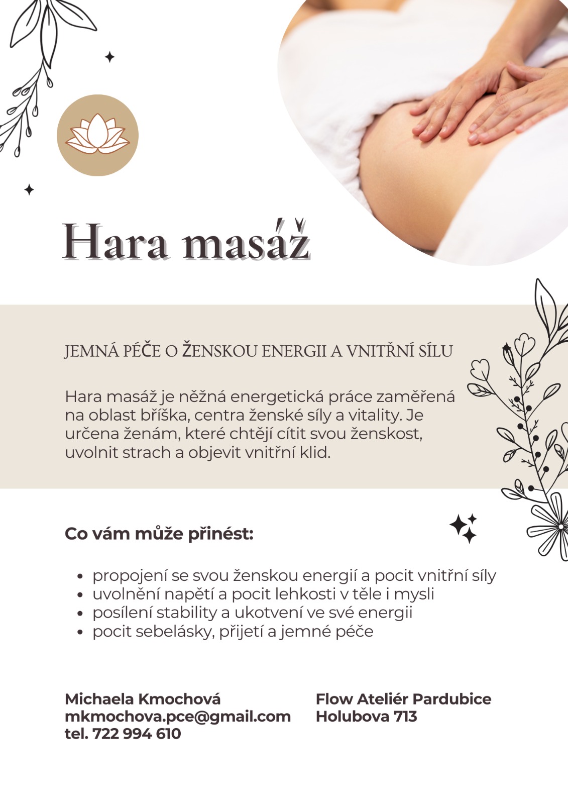 Hara masáž – energetická péče zaměřená na oblast bříška, centra ženské síly a vitality. Jemným dotykem podporuje uvolnění strachu a nalezení vnitřního klidu.